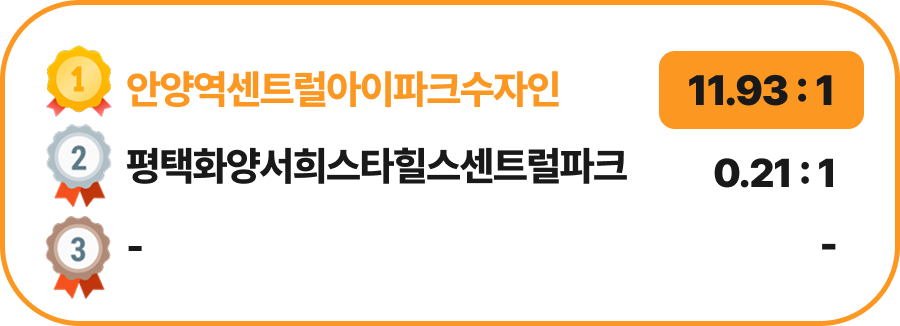 지난주 청약 시장에서 안양역 센트럴 아이파크 수자인이 11.93:1로 지난주 청약 경쟁률 1위를 기록했습니다.
