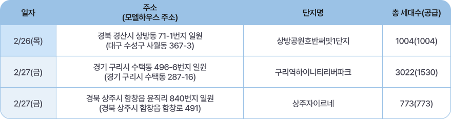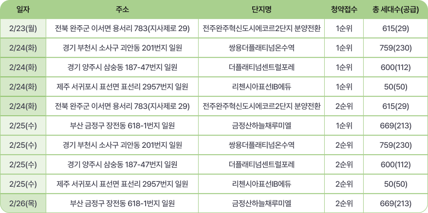 수도권과 지방 주요 도시에서 청약 접수가 이어집니다. 특히 전북 완주의 ‘전주완주혁신도시 에코르 2단지’ 공가 세대 분양 등