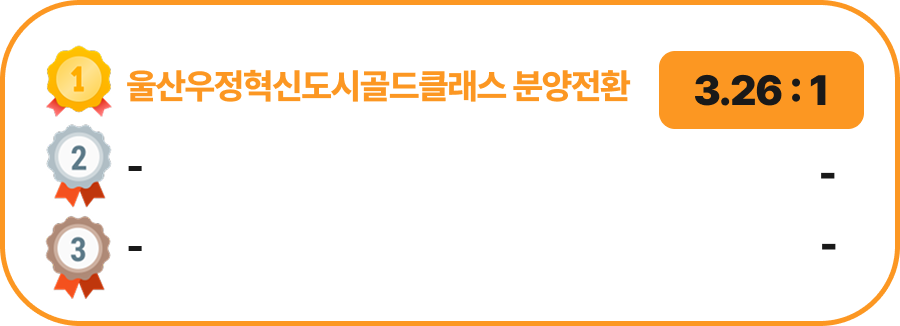울산우정혁신도시 골드클래스(B1블록) 분양전환이 3.26대 1의 경쟁률로 지난주 청약 접수 1위를 기록했으며,